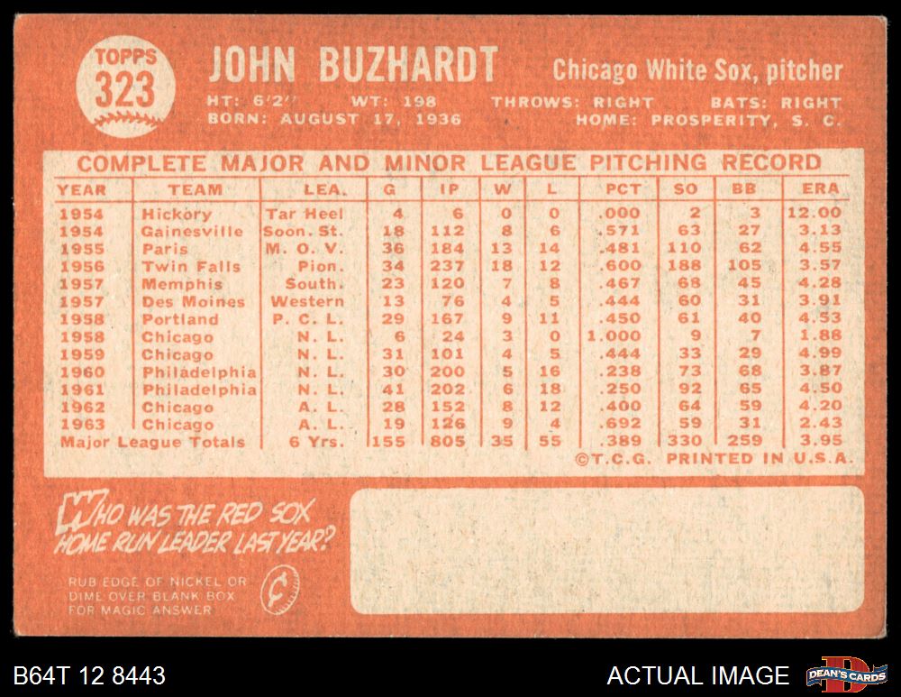 1964 Topps #323 John Buzhardt 3 - VG