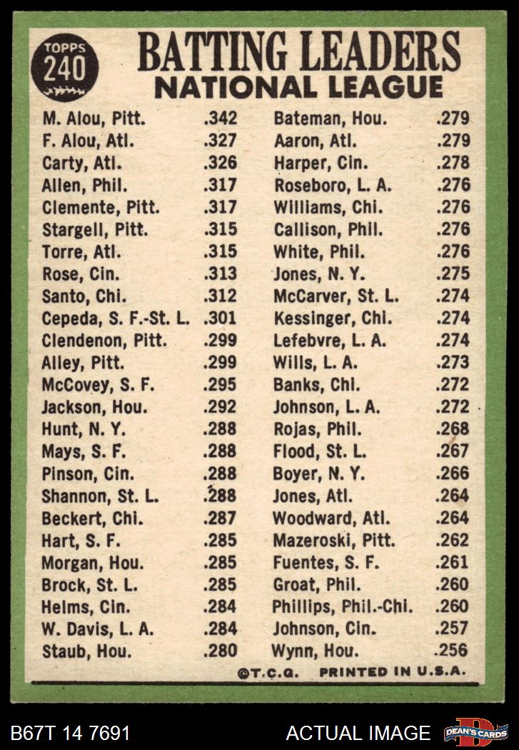 1967 Topps #240 - Felipe Alou / Matty Alou / Rico Carty NL Batting Leaders 5 - EX
