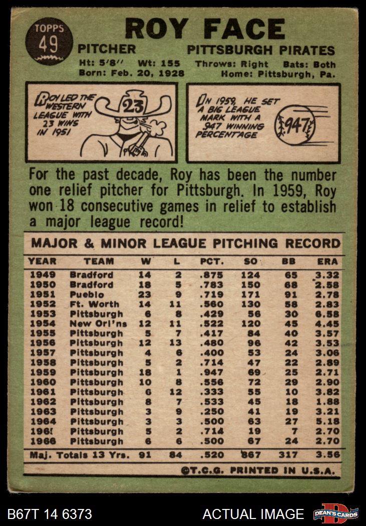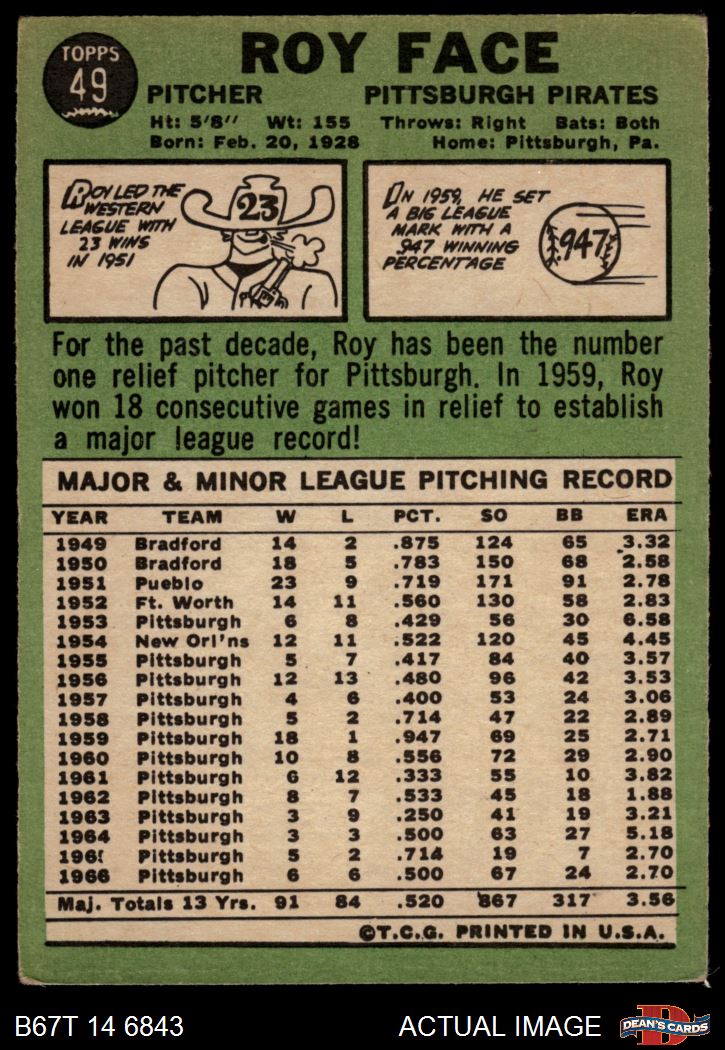 1967 Topps #49 RO Roy Face