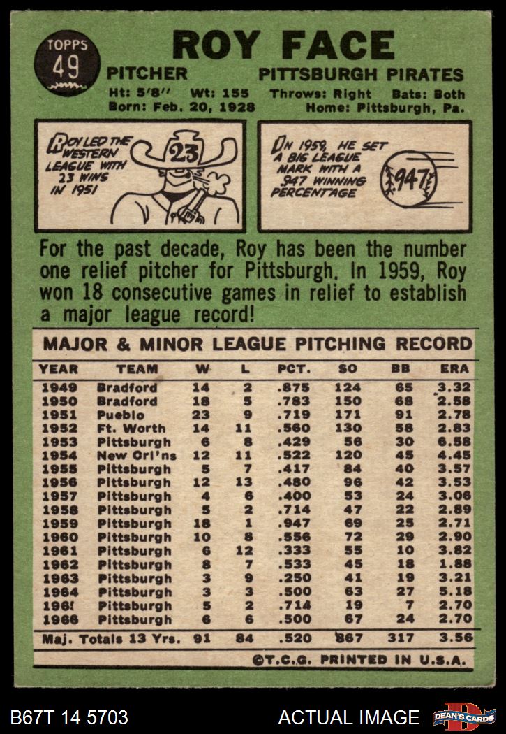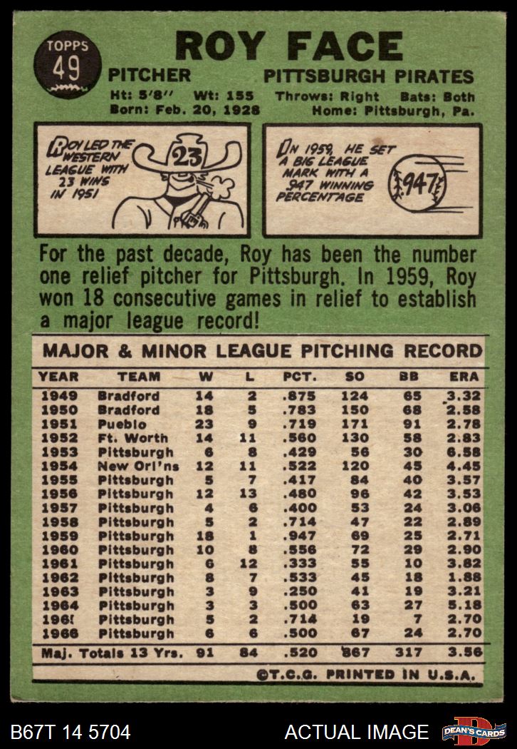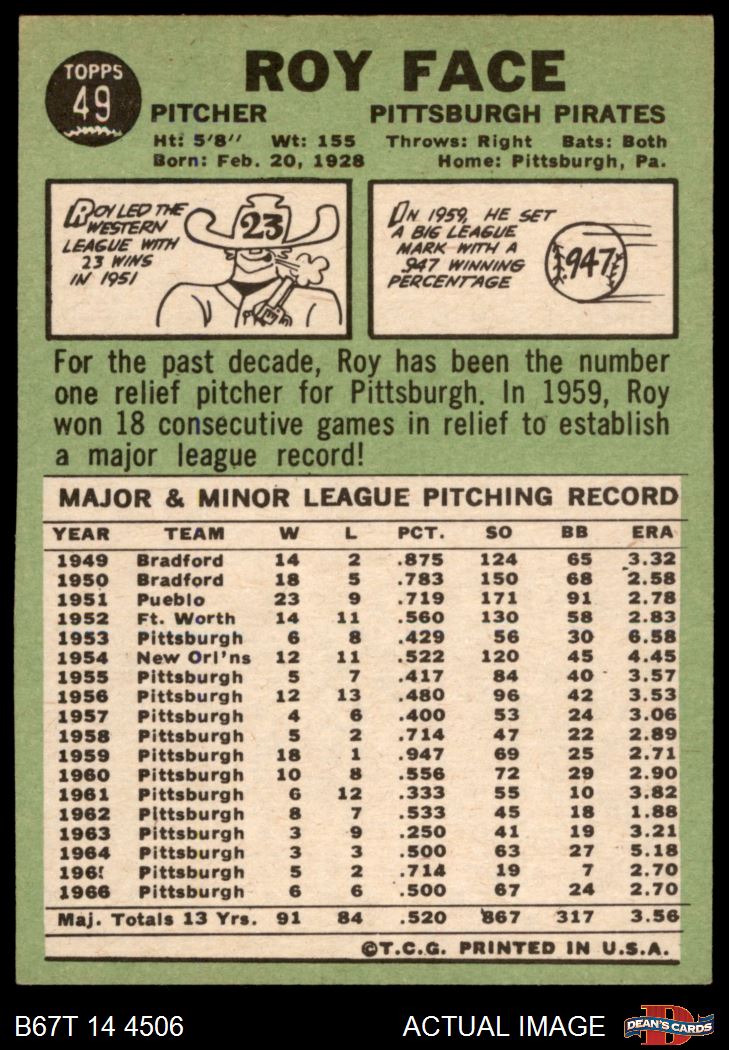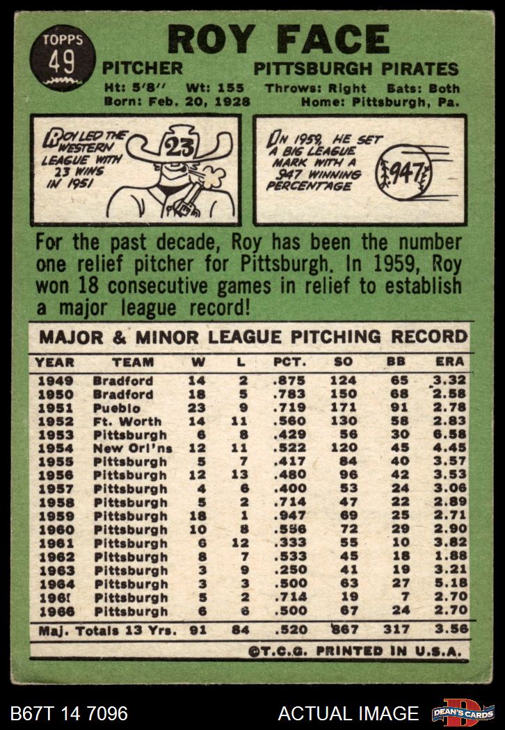 1967 Topps #49 RO Roy Face 4 - VG/EX