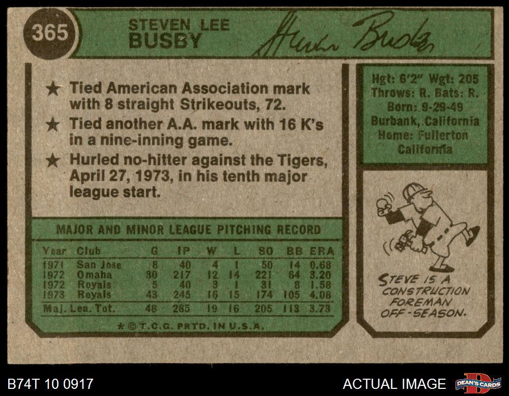 1974 Topps #365 Steve Busby 4 - VG/EX
