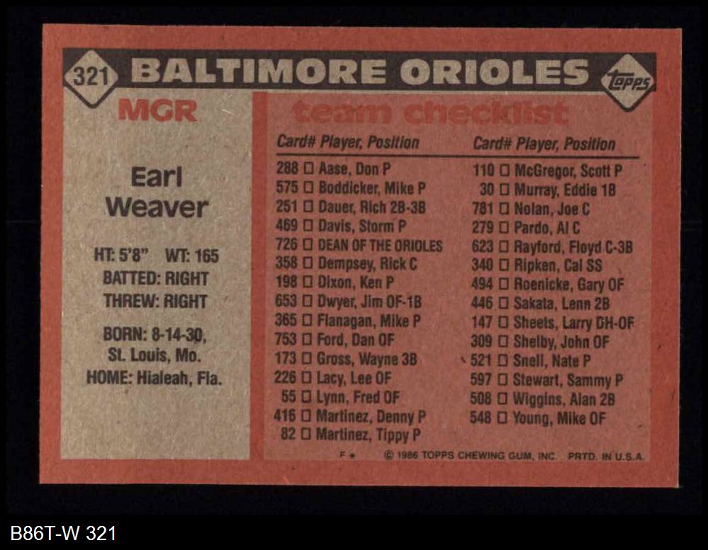 1986 Topps #321 - Earl Weaver Orioles Team Checklist 8 - NM/MT