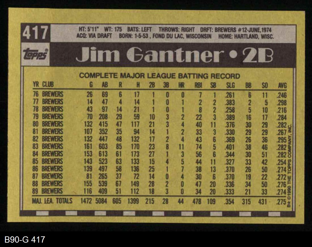 1990 Topps #417 Jim Gantner 8 - NM/MT