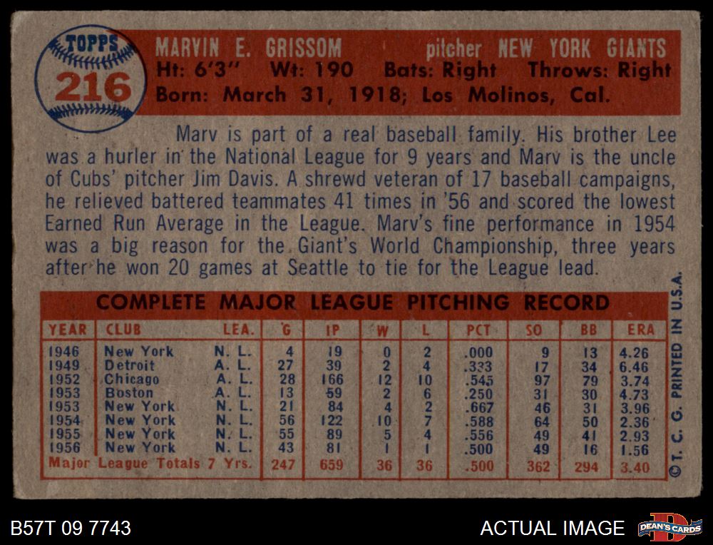 1957 Topps #216 Marv Grissom 2 - GOOD