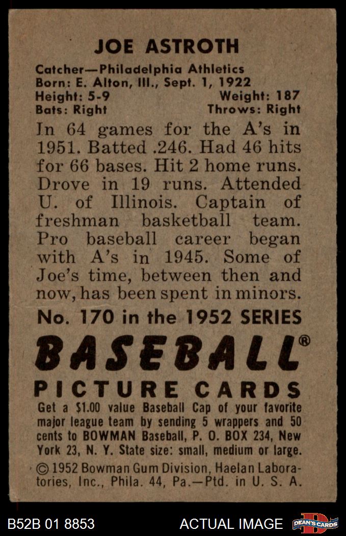 1952 Bowman #170 Joe Astroth 2 - GOOD