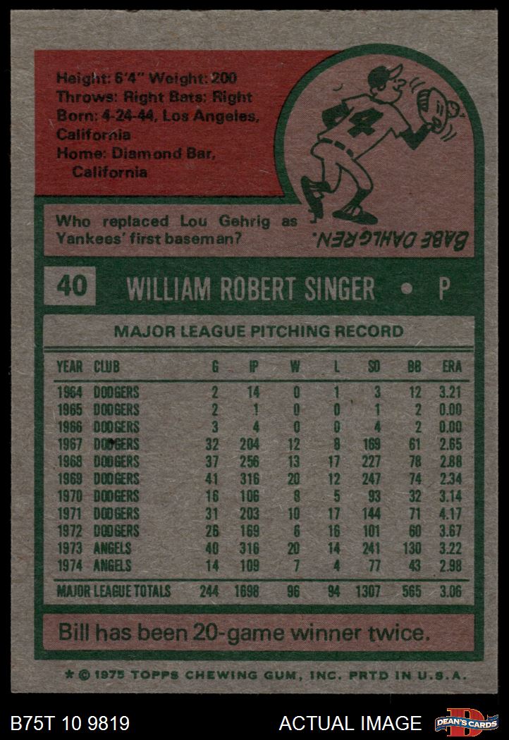 1975 Topps #40 Bill Singer 5 - EX