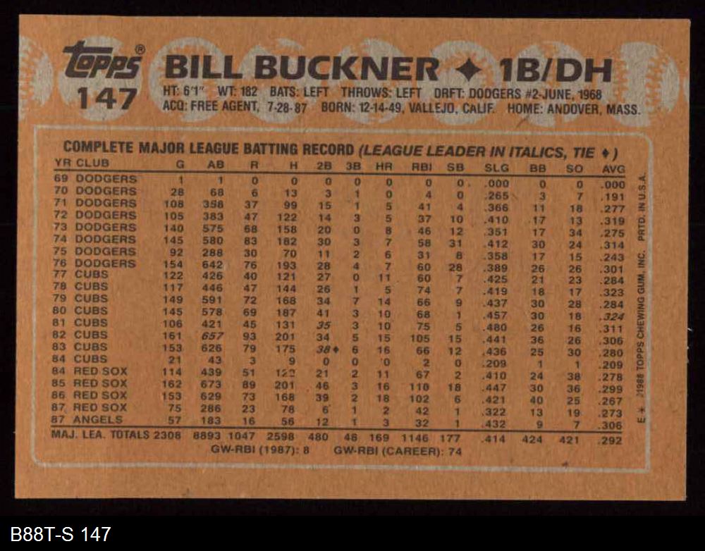 1988 Topps #147 Bill Buckner 8 - NM/MT