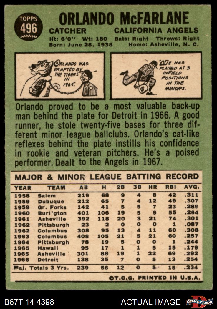 1967 Topps #496 Orlando McFarlane 2 - GOOD