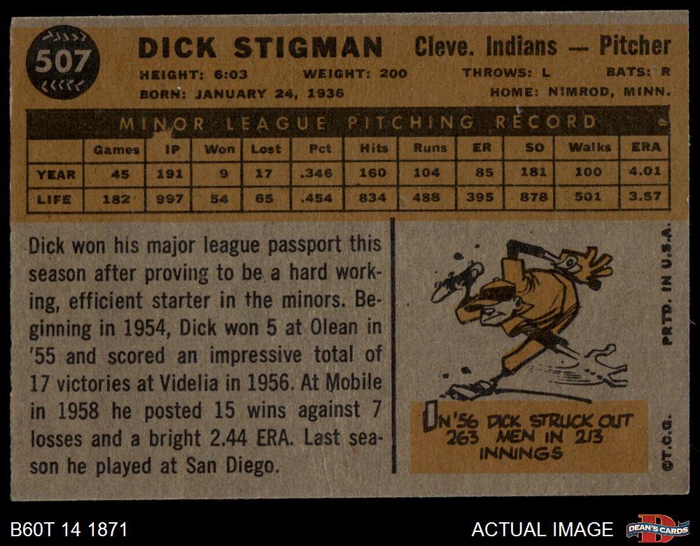 1960 Topps #507 Dick Stigman 6 - EX/MT