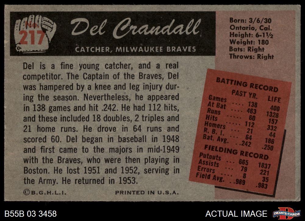 1955 Bowman #217 Del Crandall 6 - EX/MT