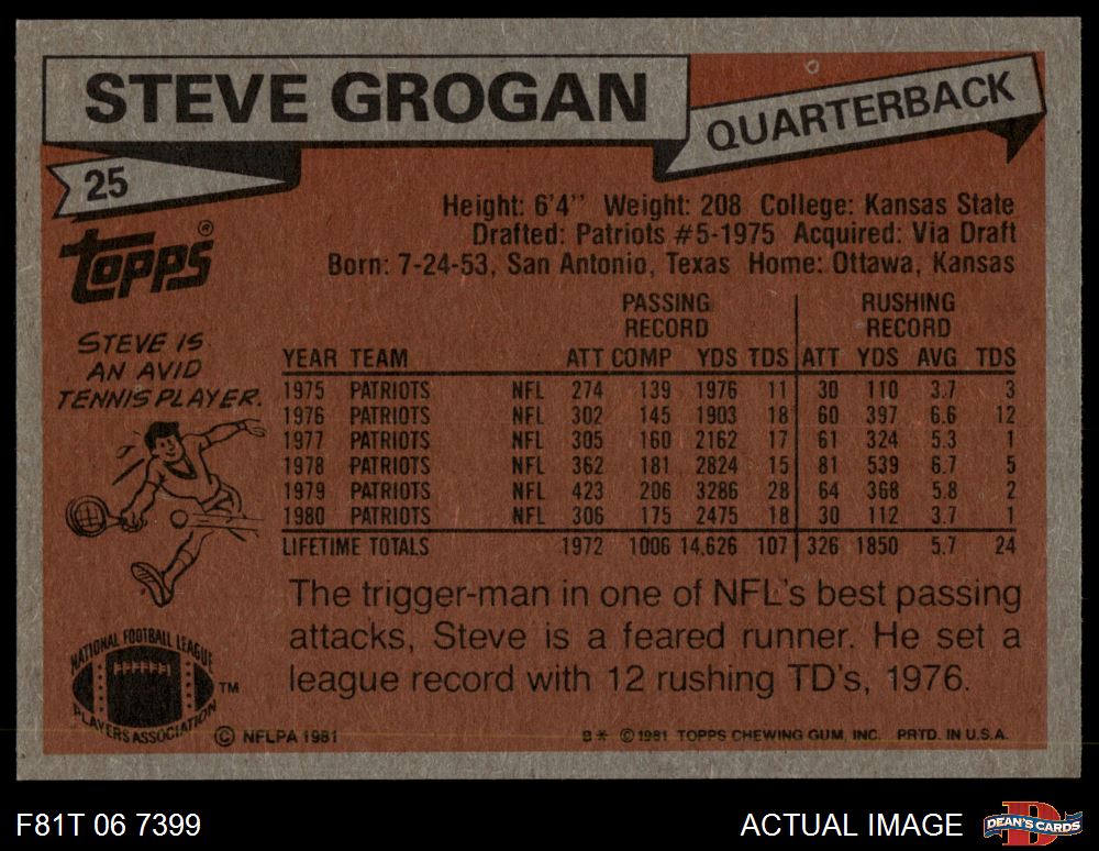 1981 Topps #25 Steve Grogan 8 - NM/MT