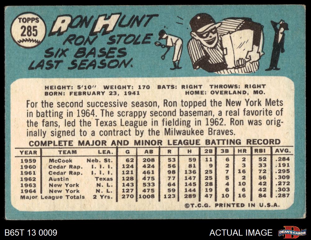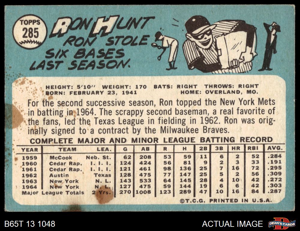 1965 Topps #285 Ron Hunt 2 - GOOD