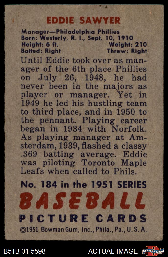 1951 Bowman #184 Eddie Sawyer 2.5 - GD+