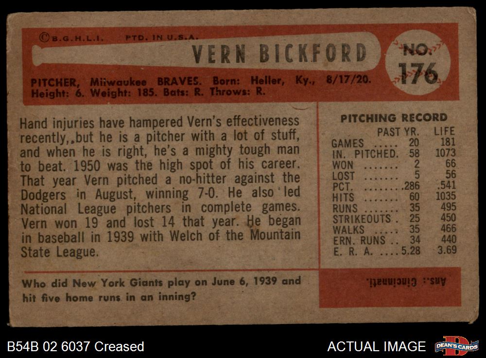 1954 Bowman #176 Vern Bickford Front Thumbnail