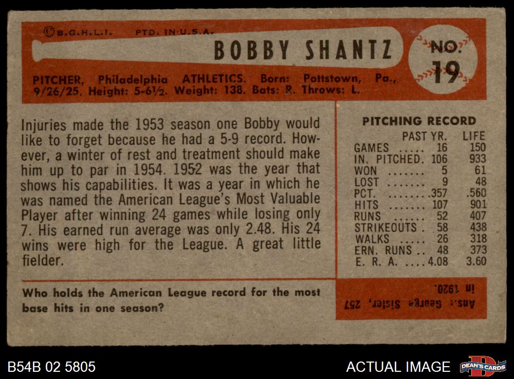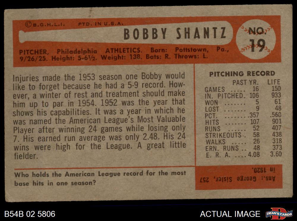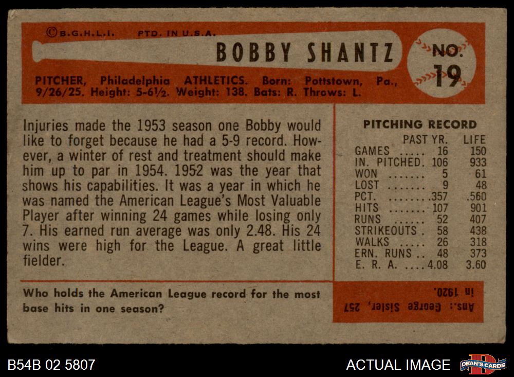 1954 Bowman #19 Bobby Shantz 2 - GOOD