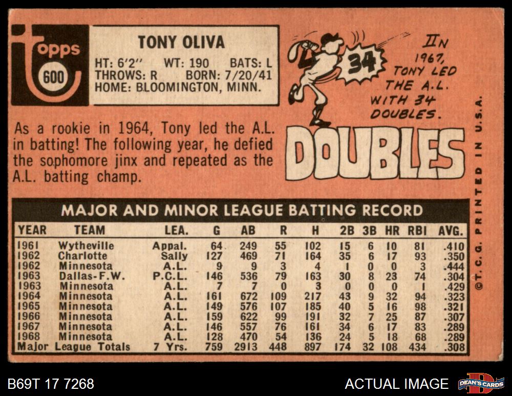1969 Topps #600 Tony Oliva 3 - VG