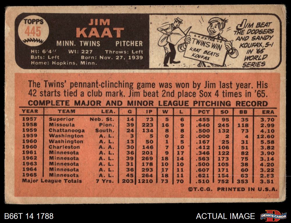1966 Topps #445 Jim Kaat 1 - POOR