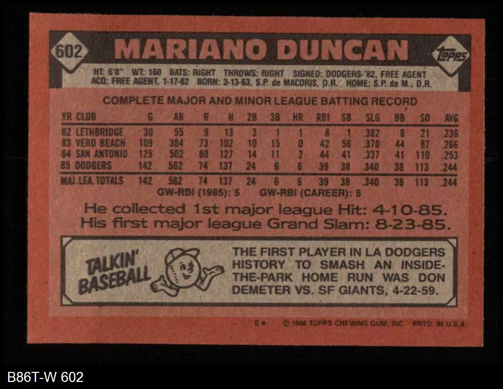 1986 Topps #602 Mariano Duncan