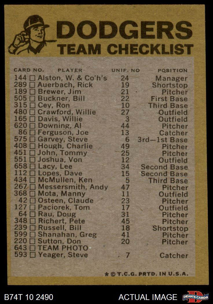 1974 Topps Los Angeles Dodgers Red Team Checklist 6 - EX/MT