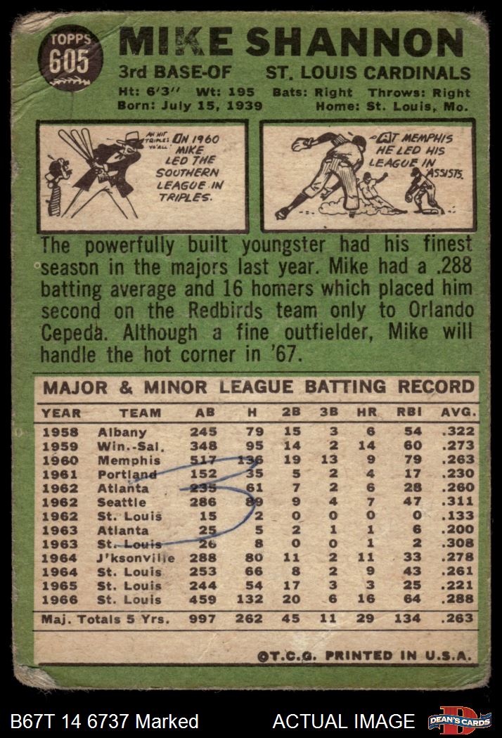 1967 Topps #605 Mike Shannon AUTHENTIC