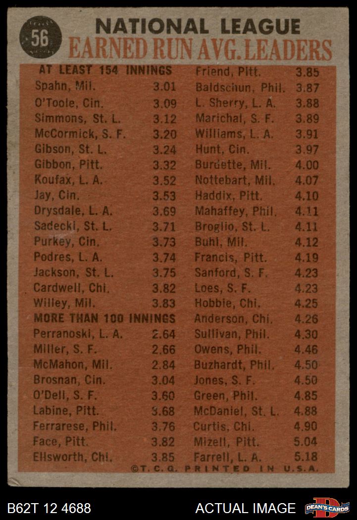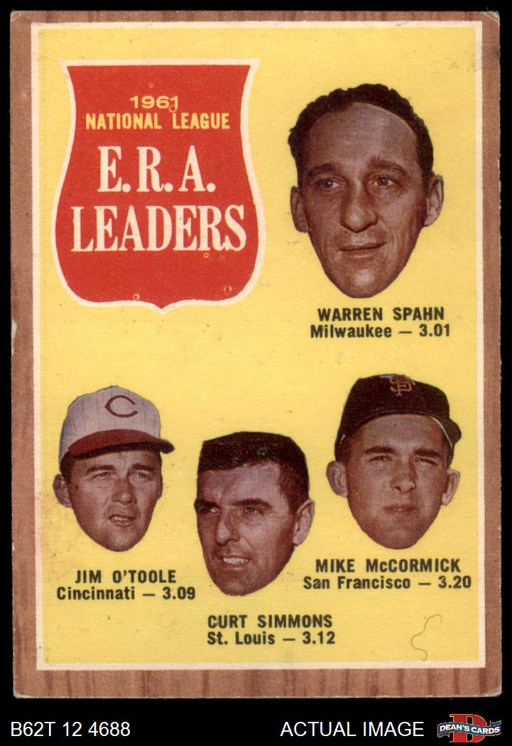 1962 Topps #56 - Warren Spahn / Jim O'Toole / Curt Simmons / Mike McCormick NL ERA Leaders 3 - VG
