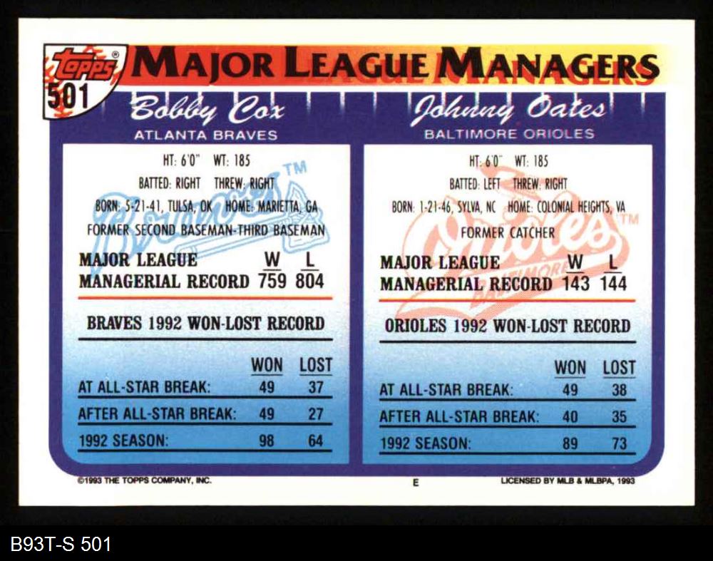 1993 Topps #501 - Johnny Oates / Bobby Cox Managers 8 - NM/MT