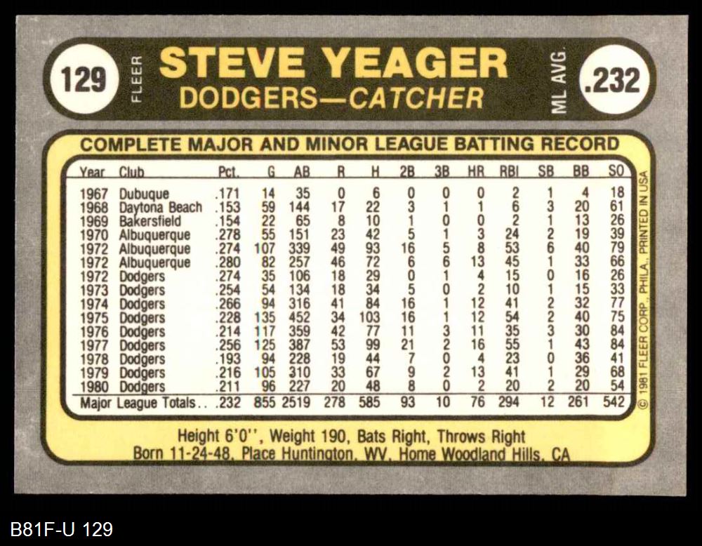 1981 Fleer #129 Steve Yeager 8 - NM/MT