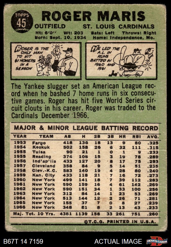 1967 Topps #45 STL Roger Maris AUTHENTIC