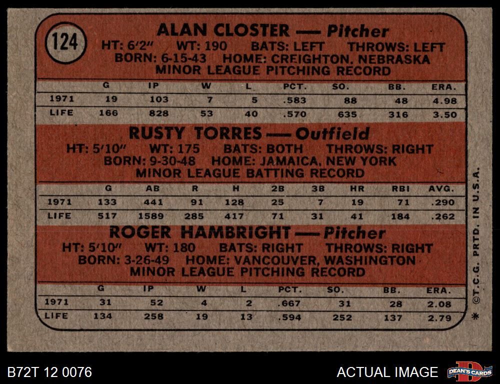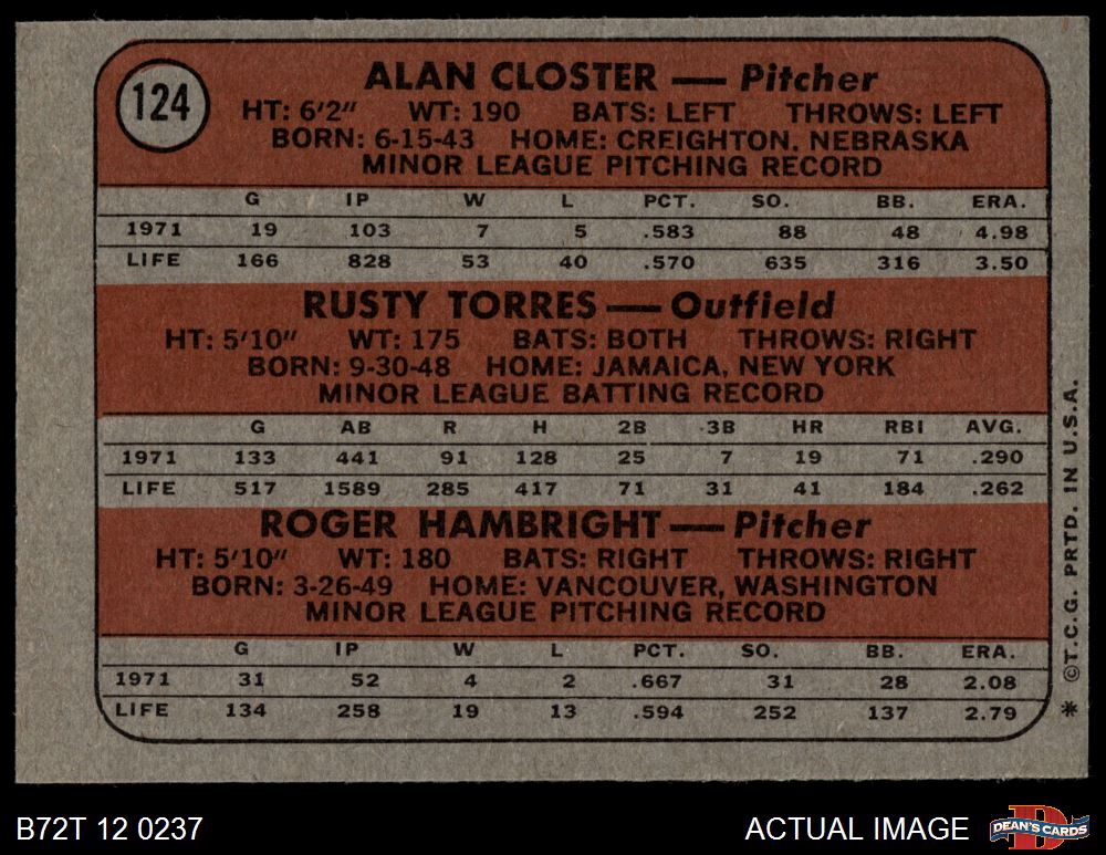 1972 Topps #124 - Alan Closter / Roger Hambright / Rusty Torres Yankees Rookies 5 - EX