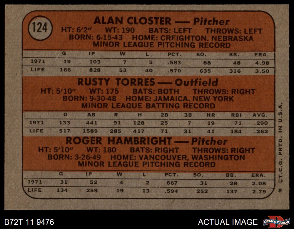1972 Topps #124 - Alan Closter / Roger Hambright / Rusty Torres Yankees Rookies 7 - NM