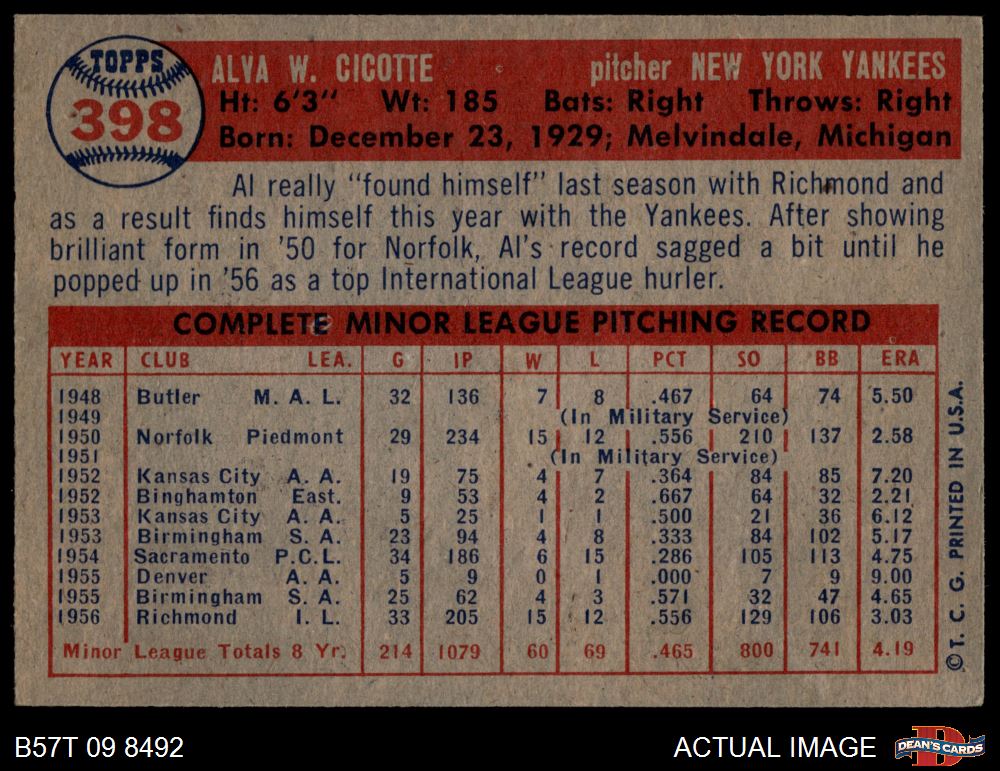 1957 Topps #398 Al Cicotte 3 - VG