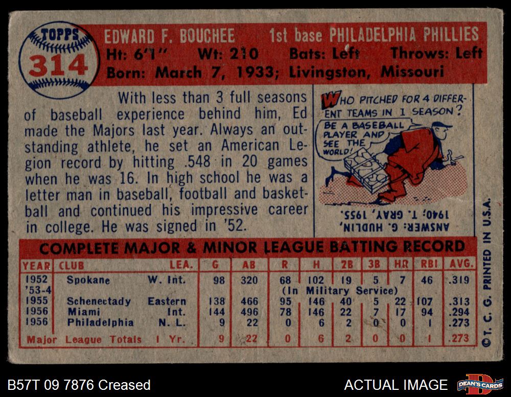 1957 Topps #314 Ed Bouchee 2 - GOOD