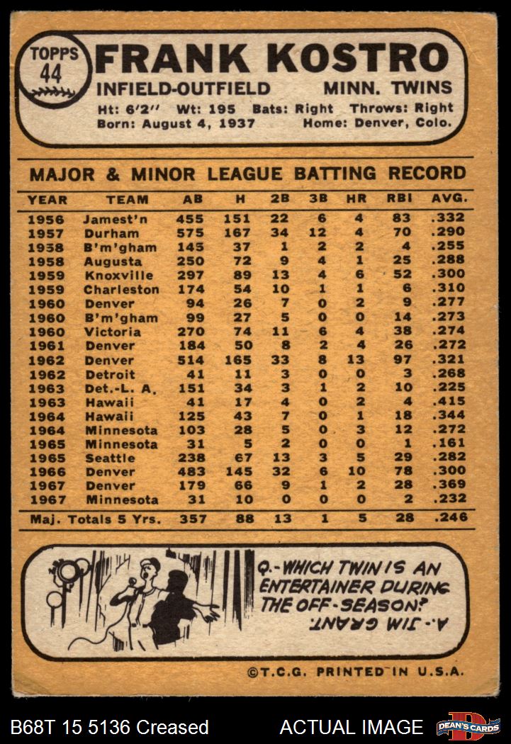 1968 Topps #44 A Frank Kostro 2 - GOOD