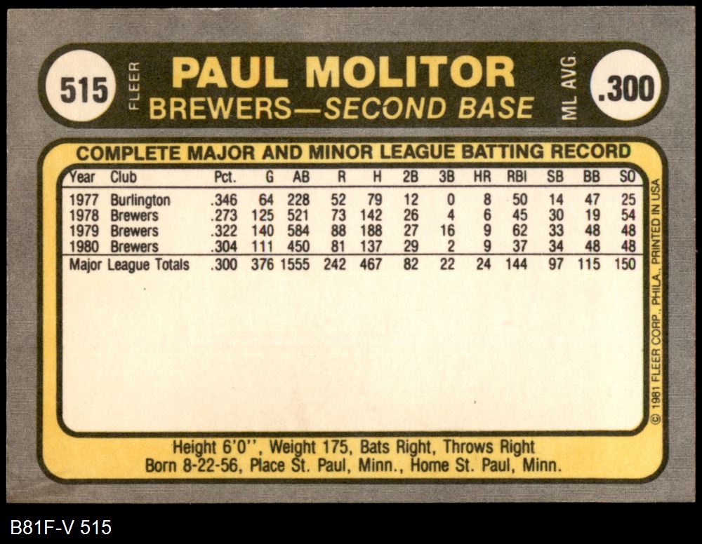 1981 Fleer #515 Paul Molitor 8 - NM/MT