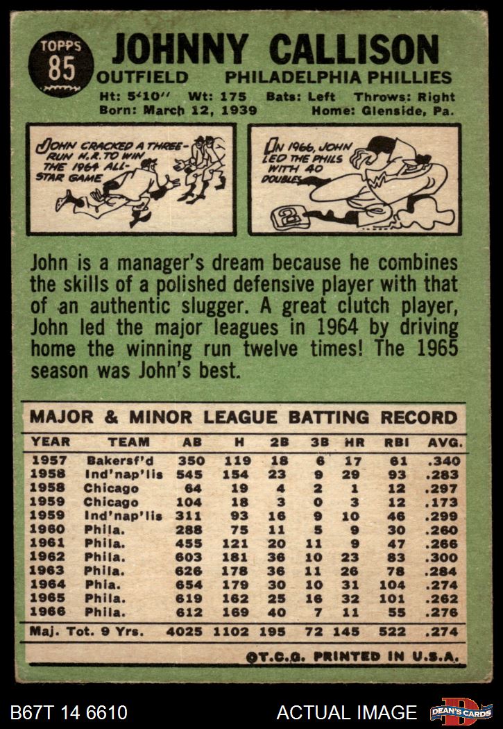 1967 Topps #85 Johnny Callison 3 - VG