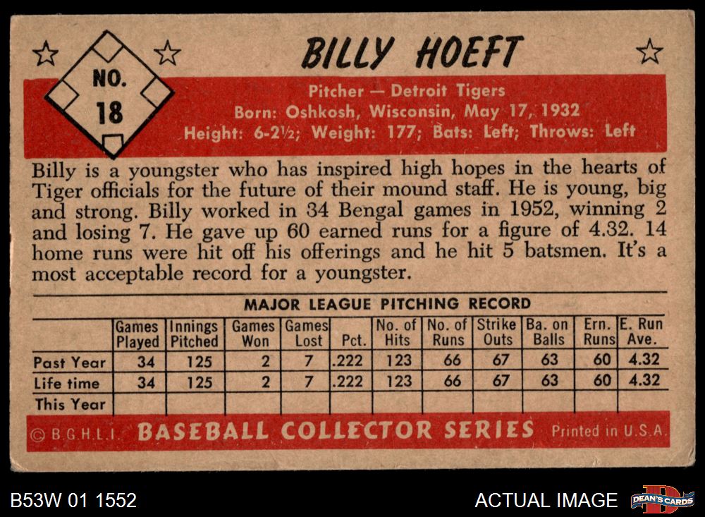 1953 Bowman B&W #18 Billy Hoeft 4 - VG/EX