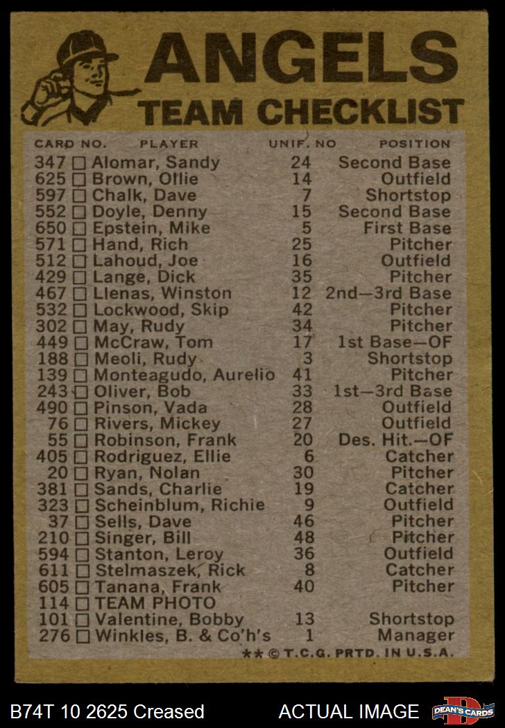 1974 Topps California Angels Red Team Checklist 2 - GOOD