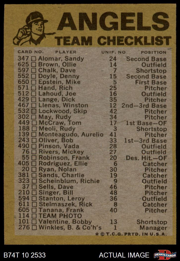 1974 Topps California Angels Red Team Checklist 5 - EX