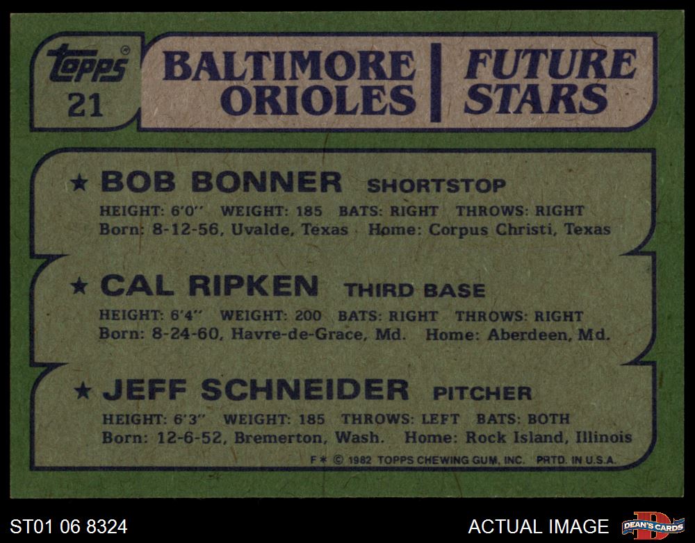 1982 Topps #21 - Cal Ripken Jr. / Bob Bonner / Jeff Schneider Orioles 7 - NM