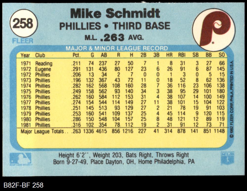1982 Fleer #258 Mike Schmidt 8 - NM/MT