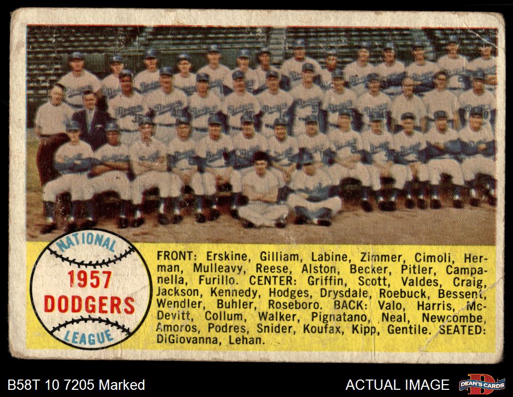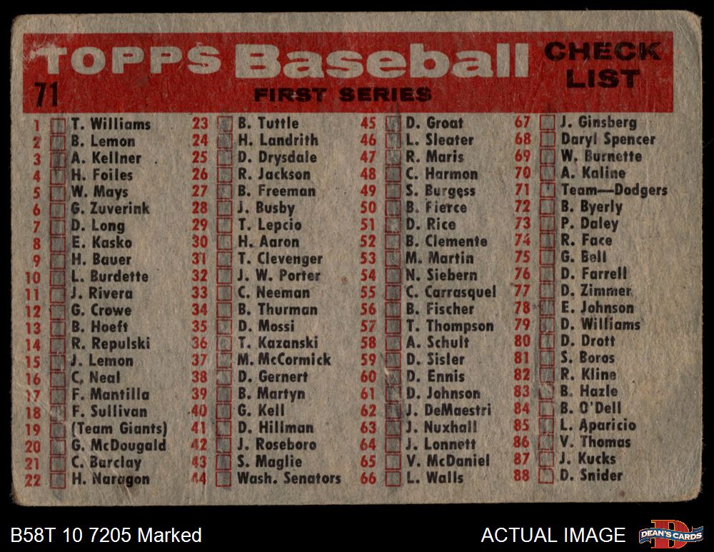 1958 Topps #71 Dodgers Team Checklist 1 - POOR