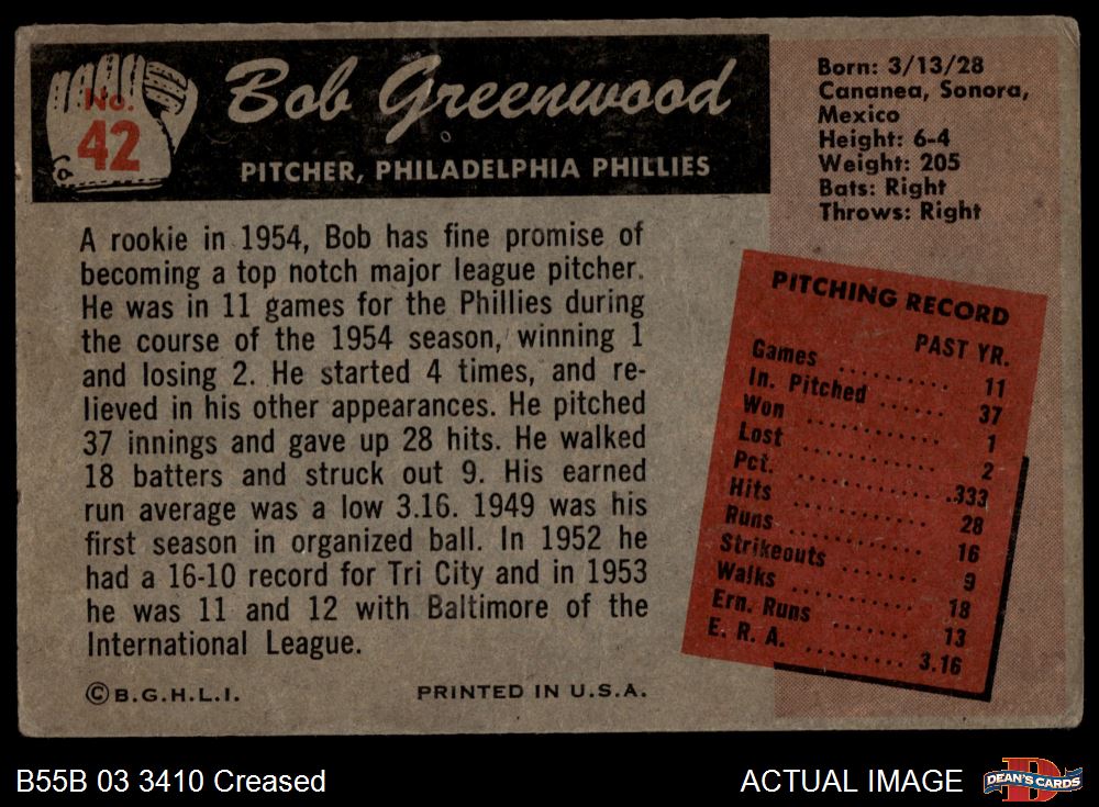 1955 Bowman #42 Bob Greenwood 2 - GOOD