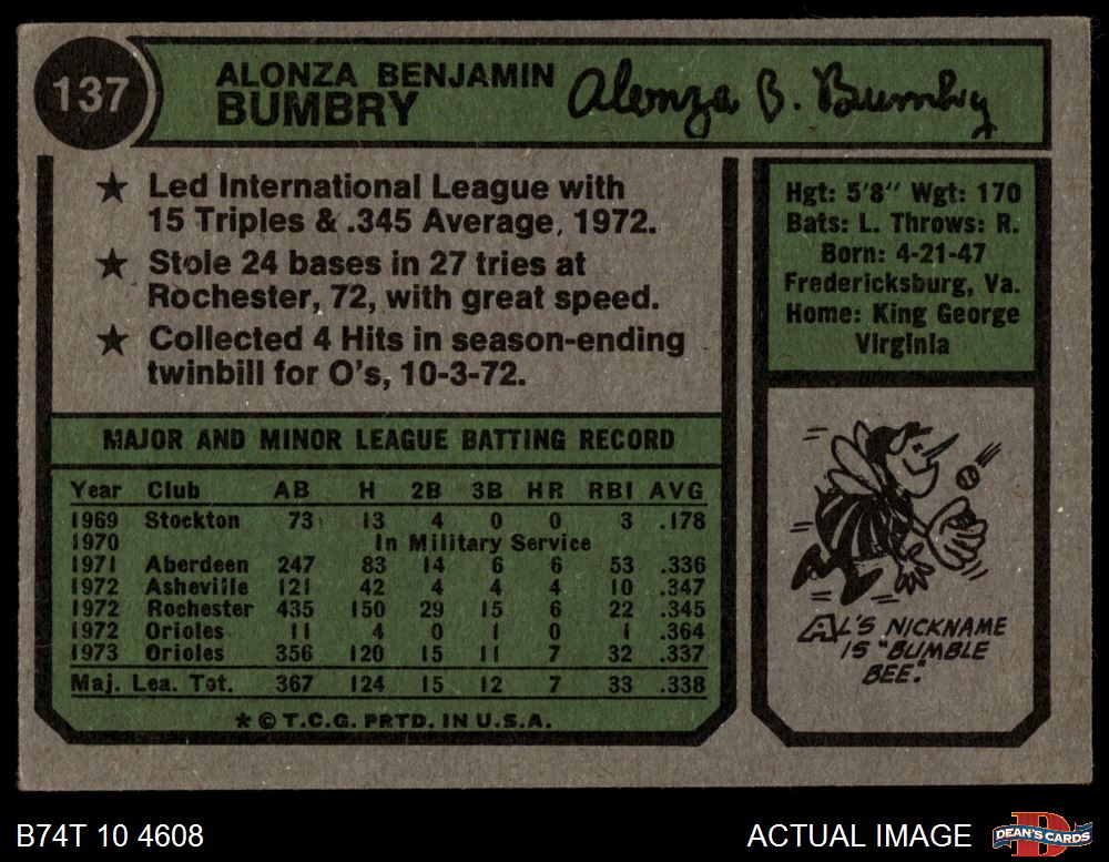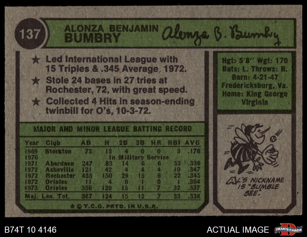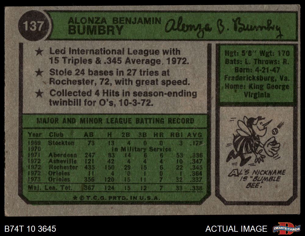 1974 Topps #137 Al Bumbry 3 - VG