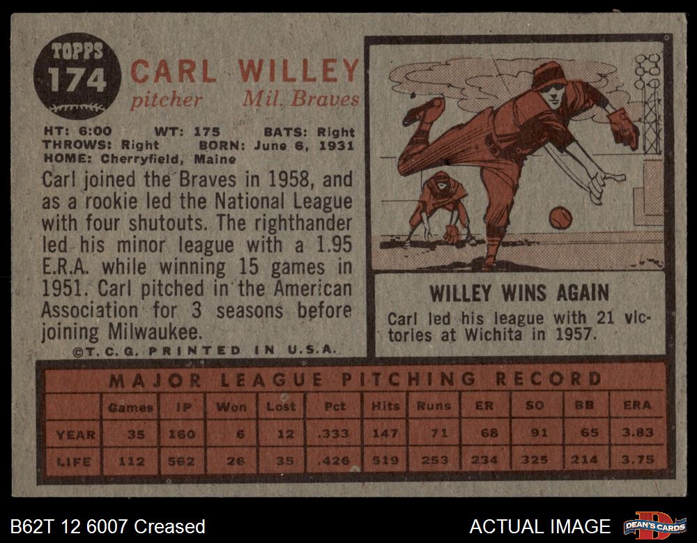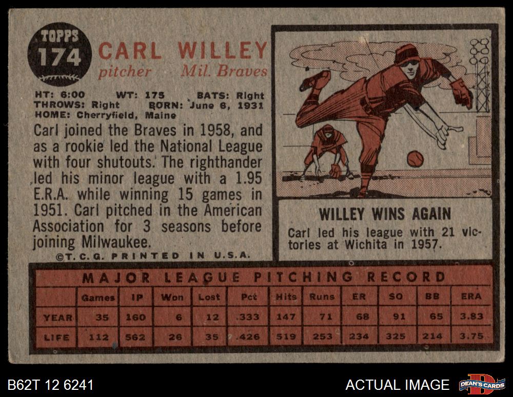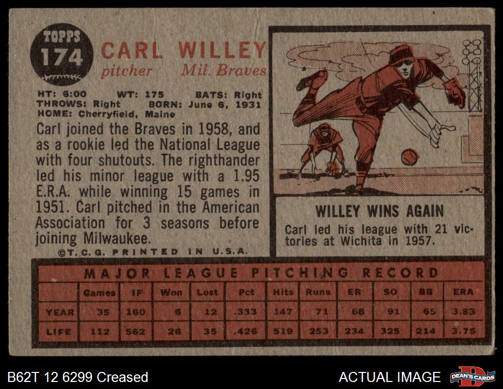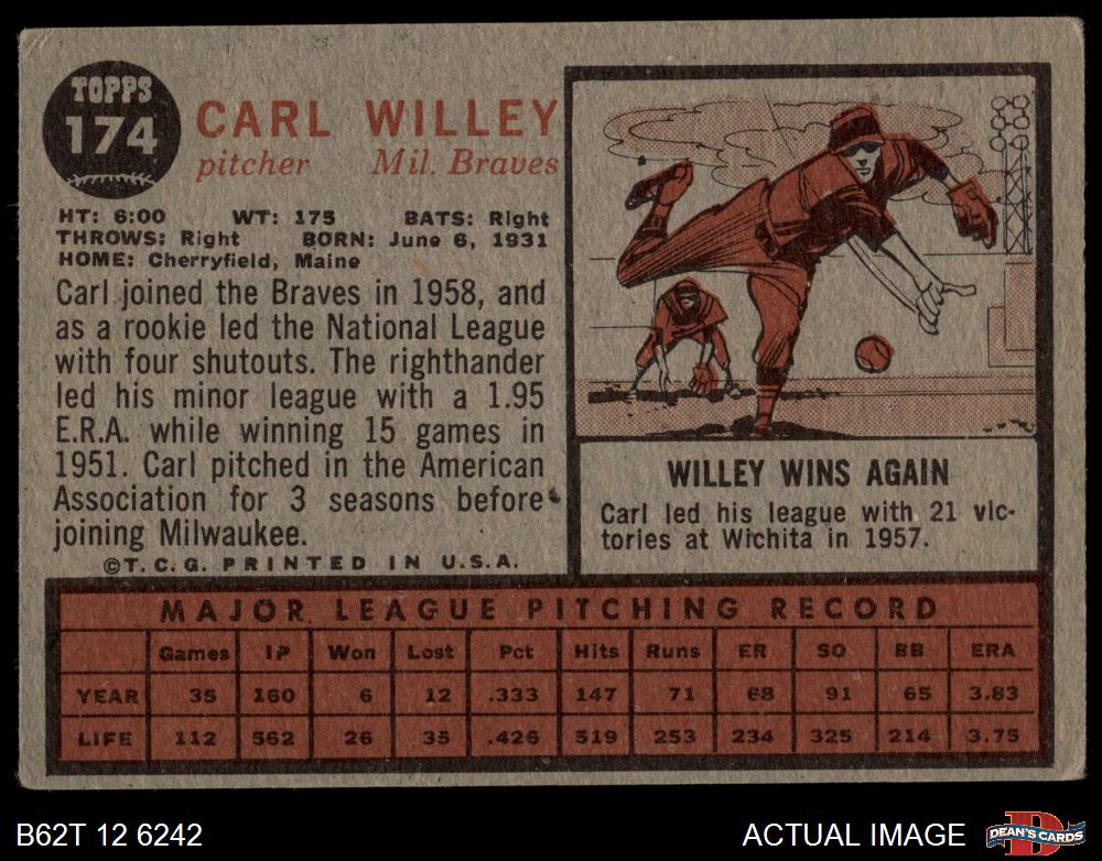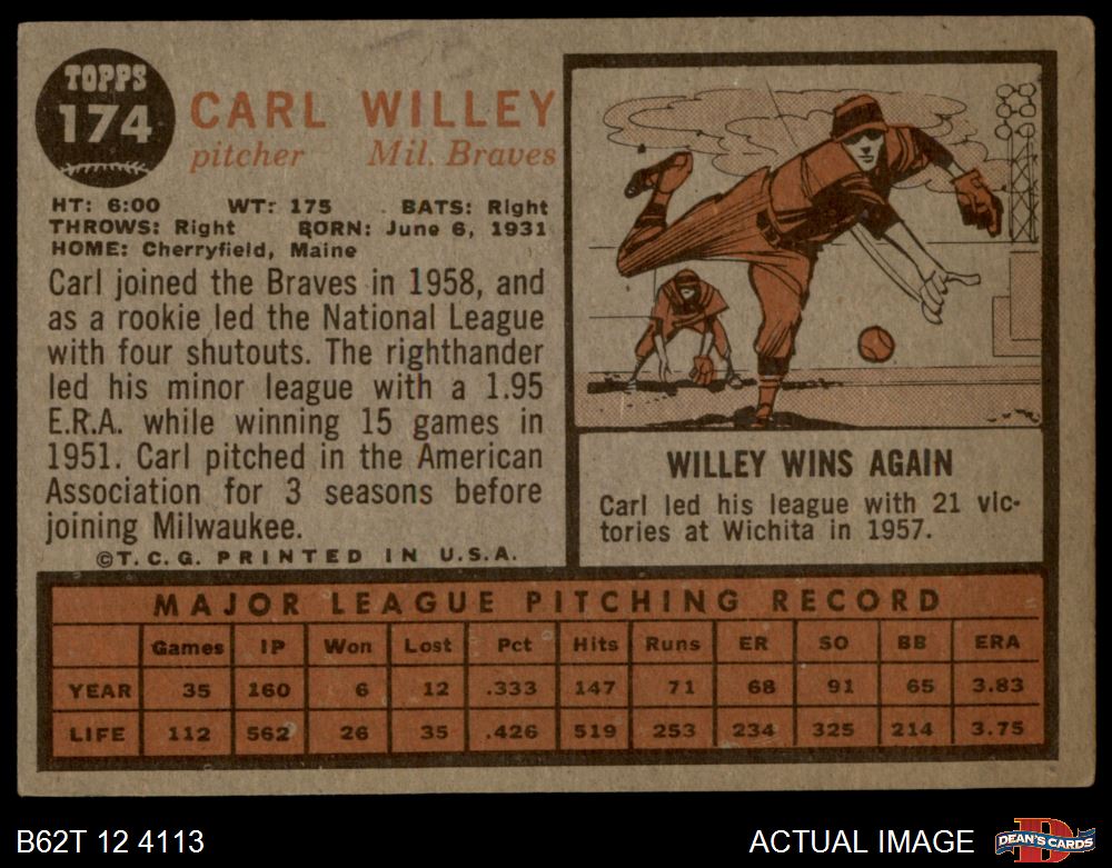 1962 Topps #174 xCAP Carl Willey