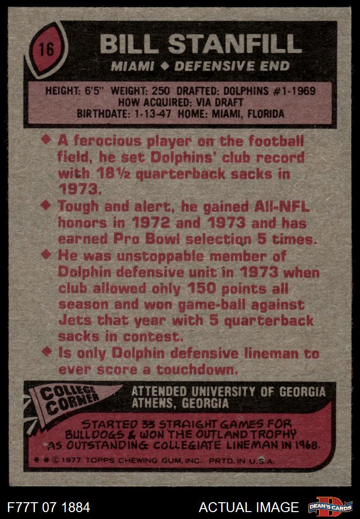 1977 Topps #16 Bill Stanfill