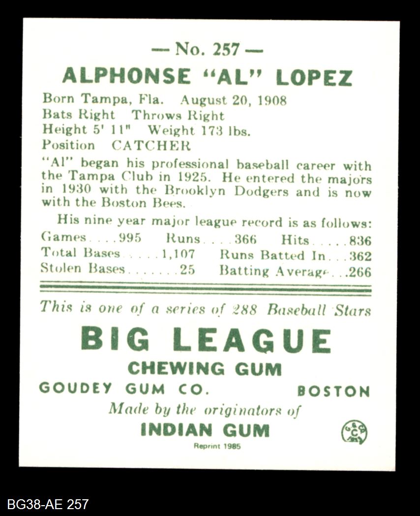 1938 Goudey Heads-Up Reprint #257 Al Lopez