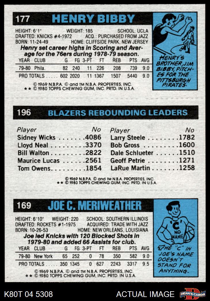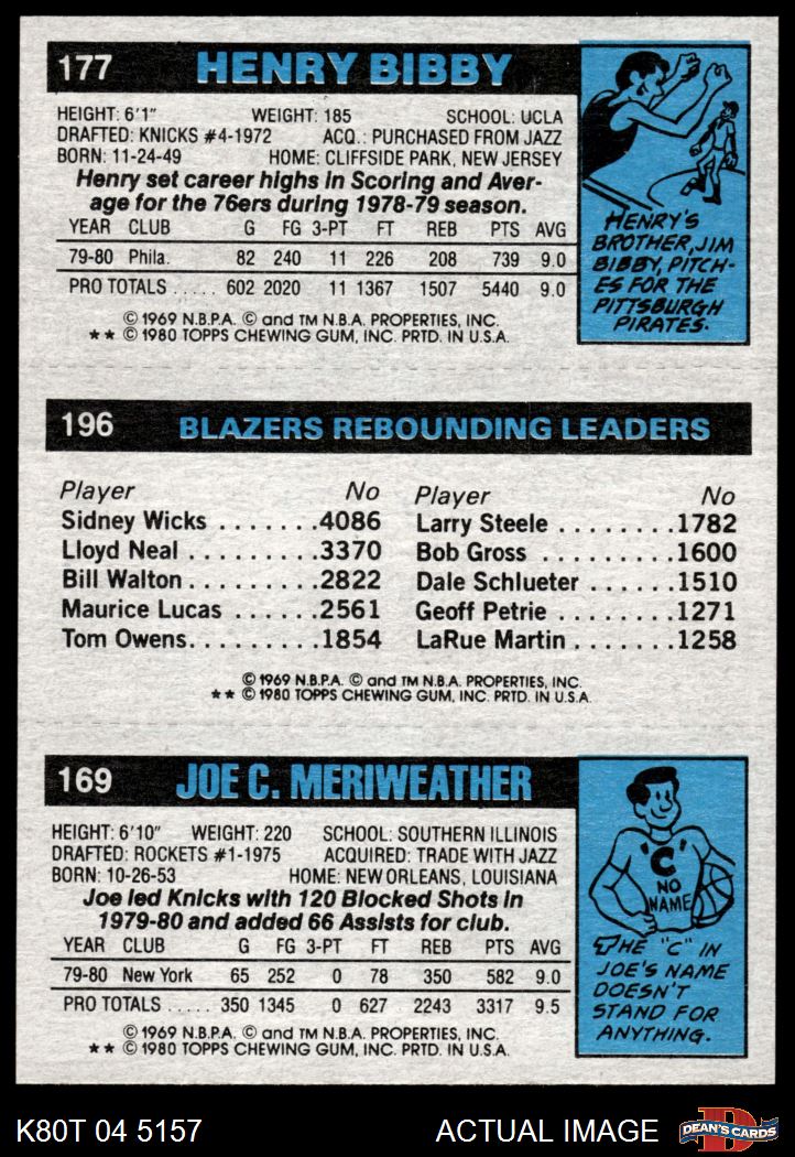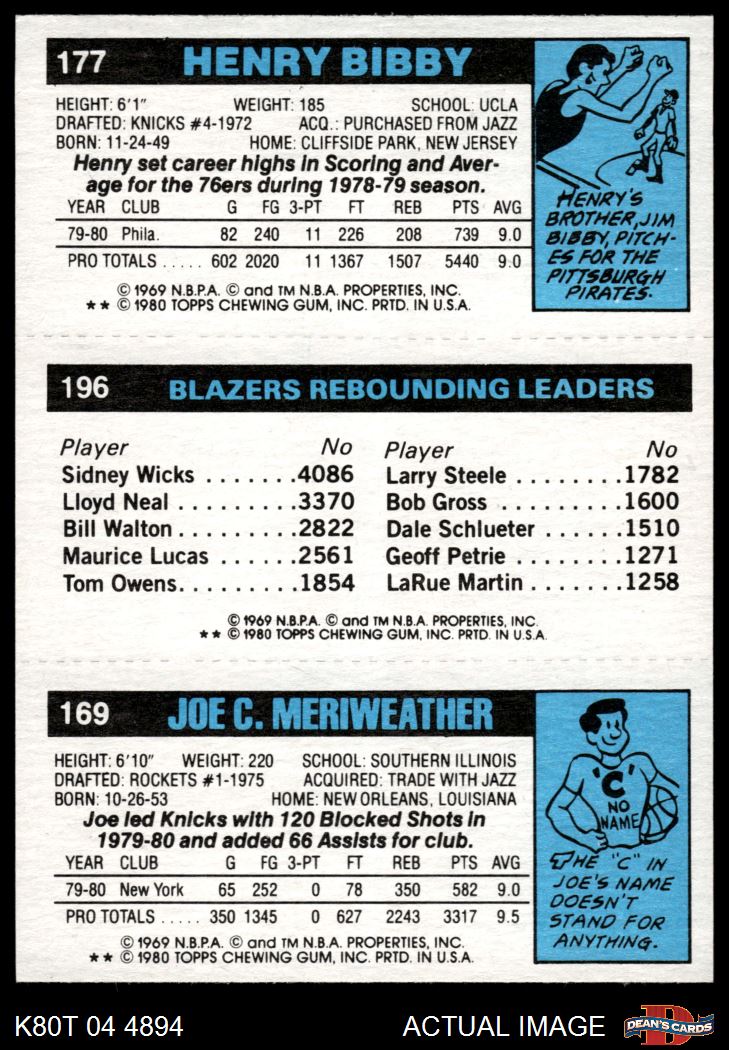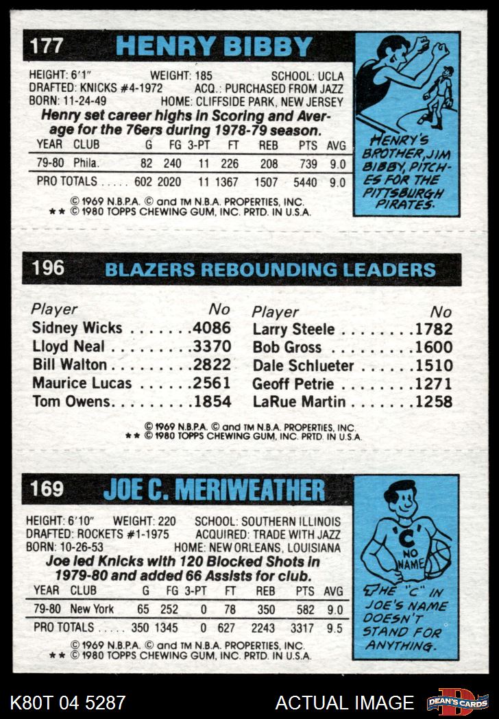 1980 Topps - Joe Meriweather / Kermit Washington / Henry Bibby 169 / 196 / 177 8 - NM/MT