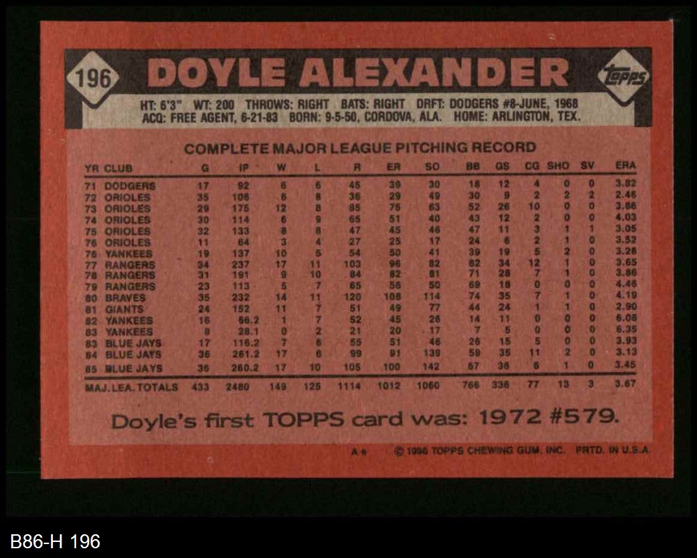 1986 Topps #196 Doyle Alexander 8 - NM/MT