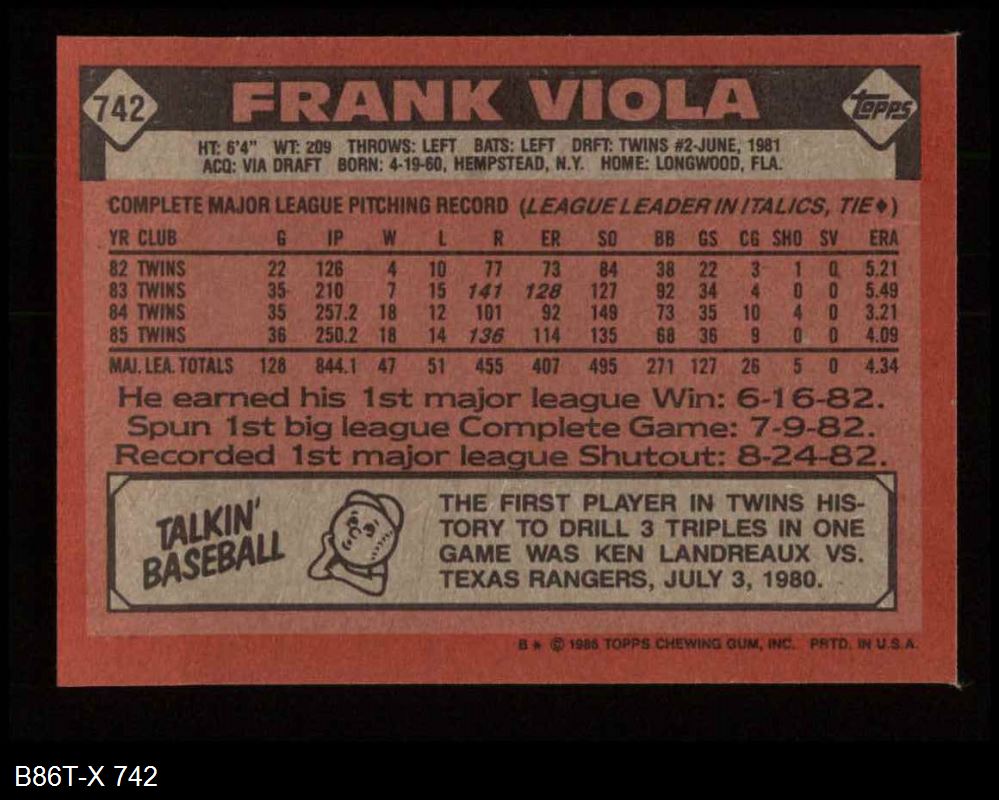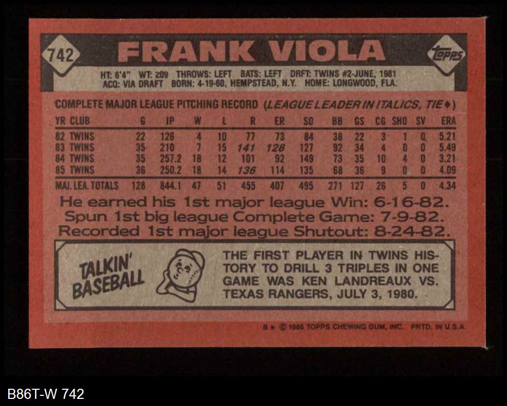 1986 Topps #742 Frank Viola 8 - NM/MT
