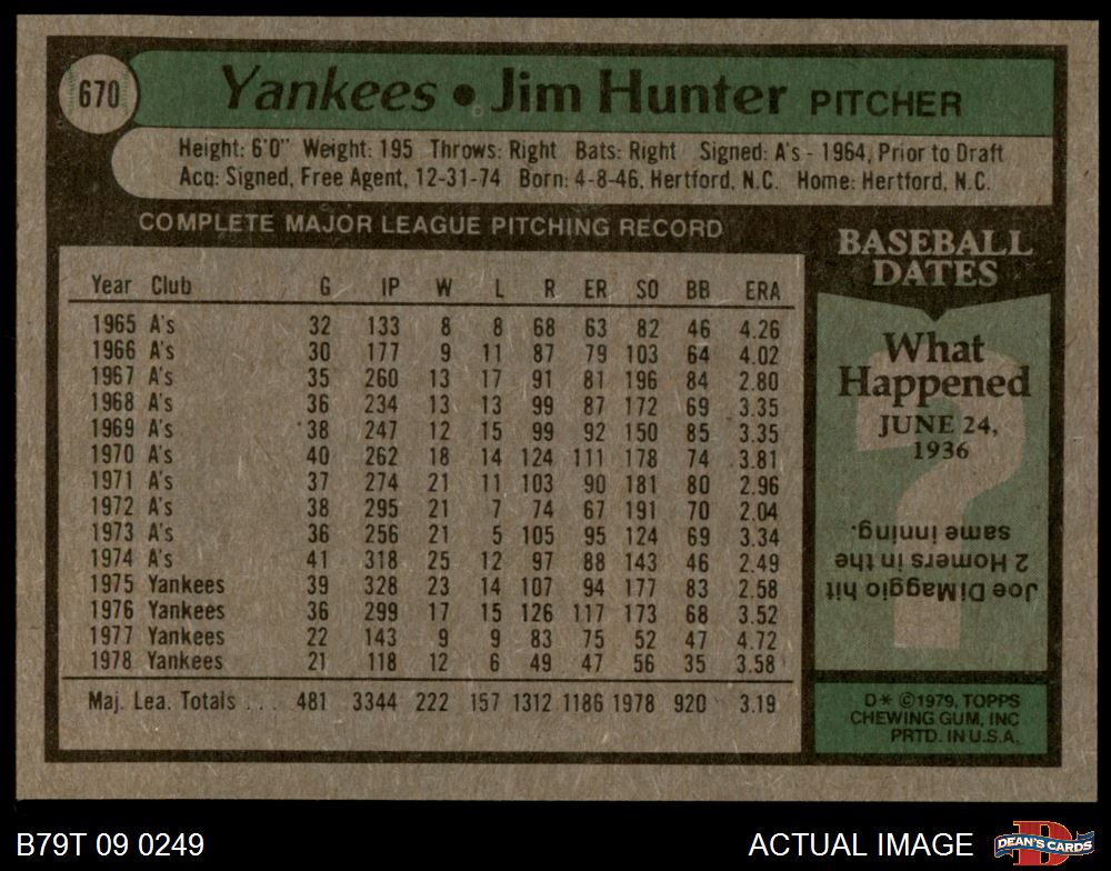 1979 Topps #670 Catfish Hunter 7 - NM